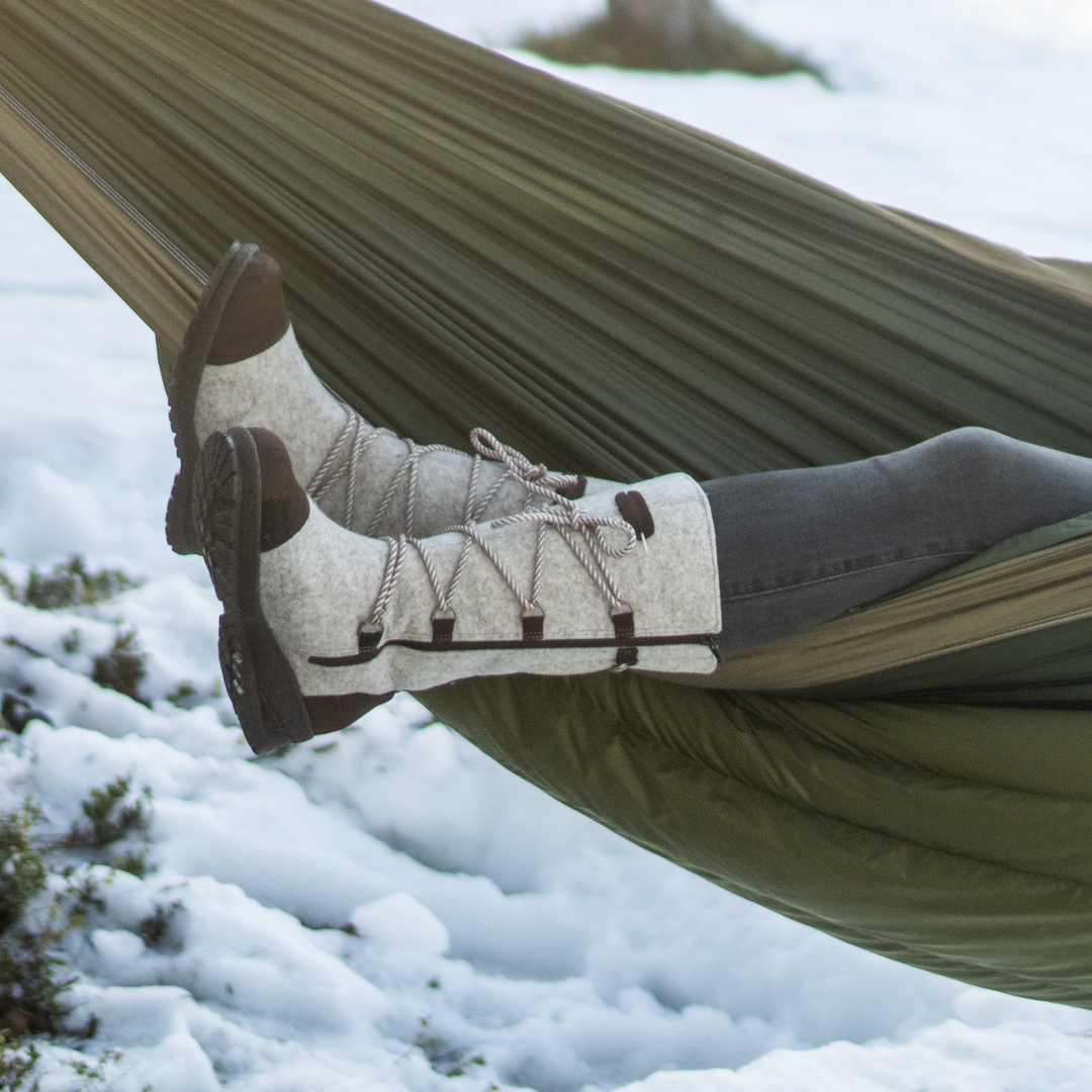 Felt boots have been part of Finnish winter life for generations because they simply work. Wool felt naturally insulates against the cold while allowing moisture to escape, keeping feet warm without overheating. It’s a material shaped by nature and perfected by experience, ideally suited to long winters and everyday use.